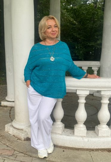 Конструкция спущенное плечо. Вяжется сверху вниз без швов. Плотность 24п х 31р. Возможно связать со своей плотностью. 13 видео.