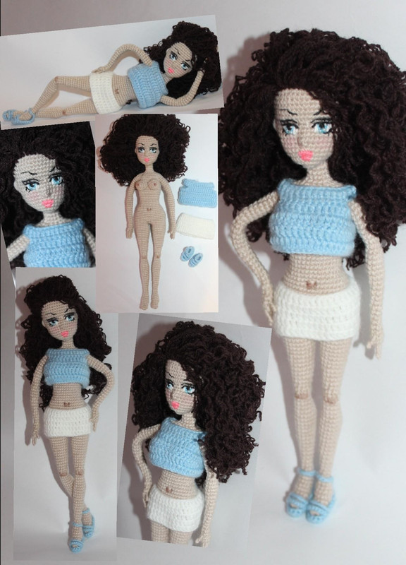 МАТЕРИАЛЫ 1. Пряжа телесного цвета для тела (я использую «ДЕТСКАЯ ПЕХОРКА» акрил) 2. Крючок (0.7-0.8) 3. Наполнитель: синтепон 4. Игла для вышивания 5. Пряжа для волос коричневого цвета 6. Нитки мулине (белый, голубой, черный и розовый цвета) 7. Для каркаса используем толстую проволоку 8. Тонкая проволока для рук и пальцев 9. Пряжа для наряда (белый и голубой) 10. Пастель розовых и коричневых оттенков 11. Клей момент «Кристалл»
