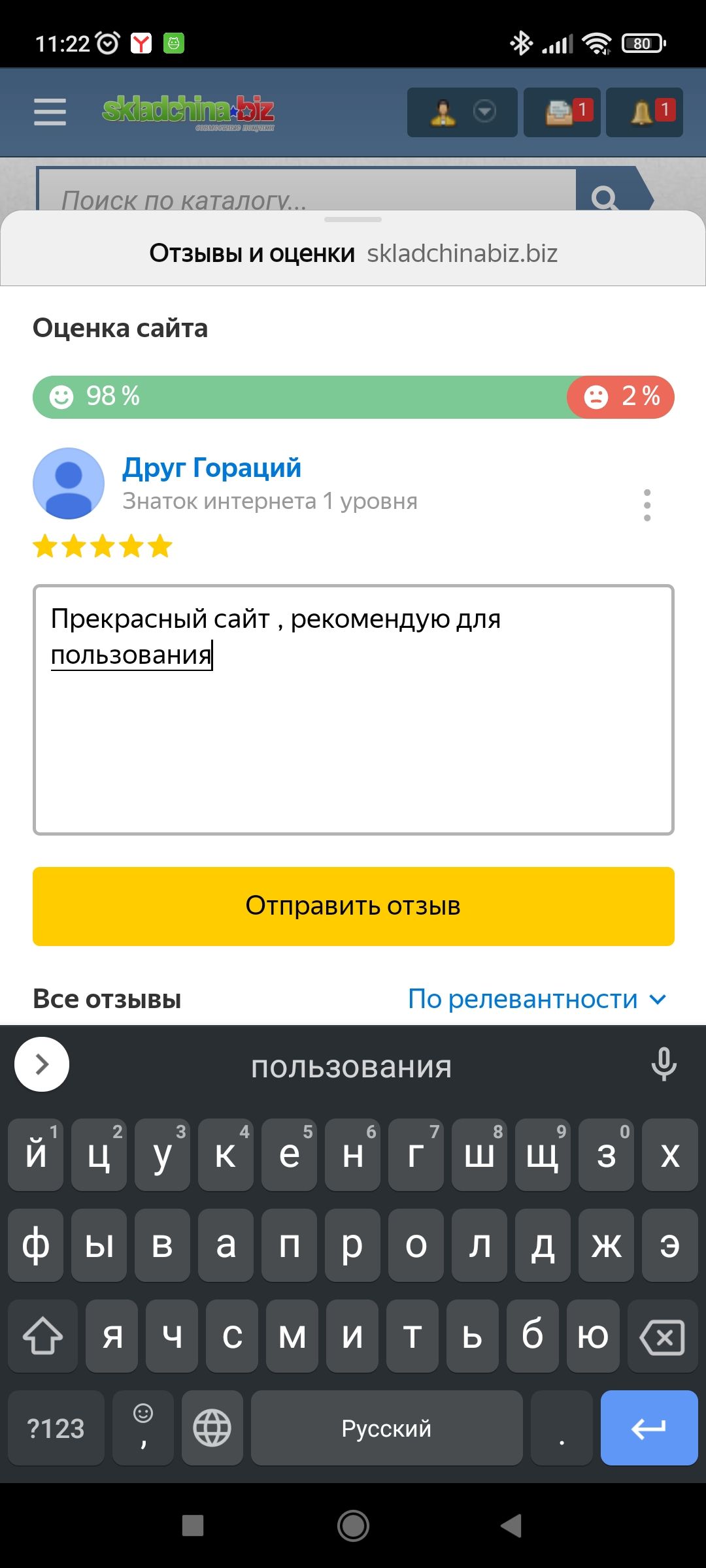 Доброго дня! У меня ни с ноутбука, ни с телефона нет в строке браузера яндекс кнопки отзывов для вашего сайта.