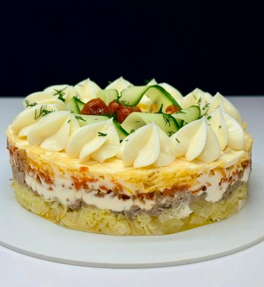 Получается слоёный салат с богатым, насыщенным вкусом, который отлично подойдет как для праздничного стола, так и для домашнего ужина.